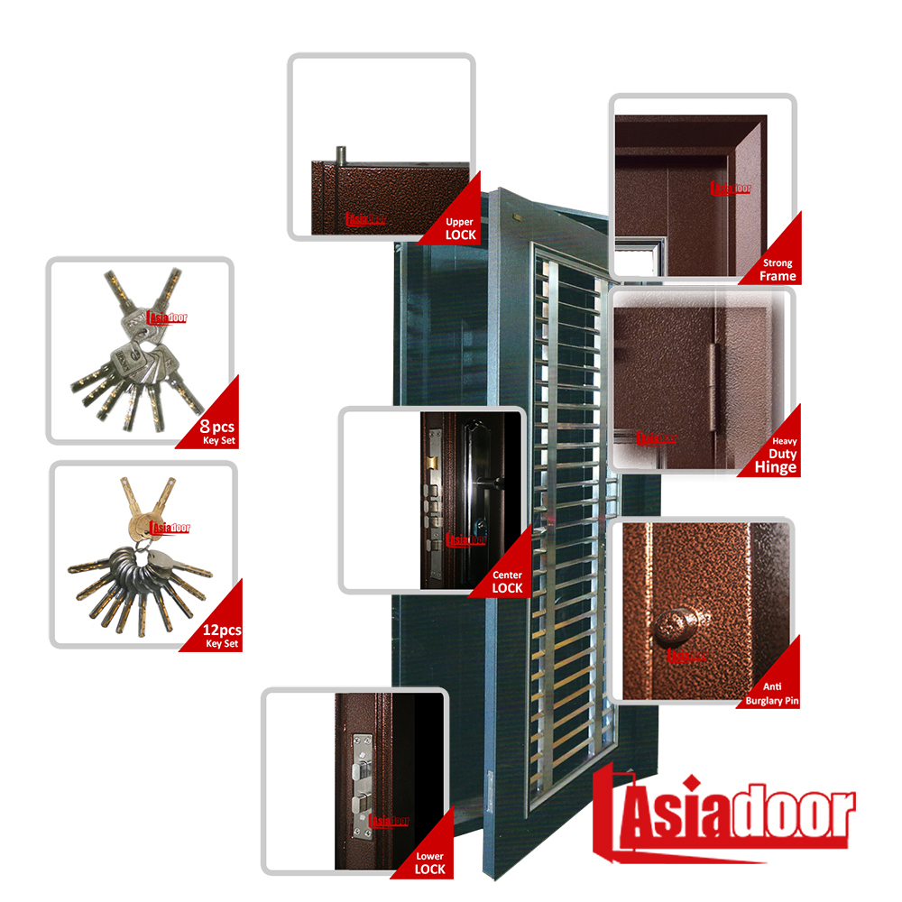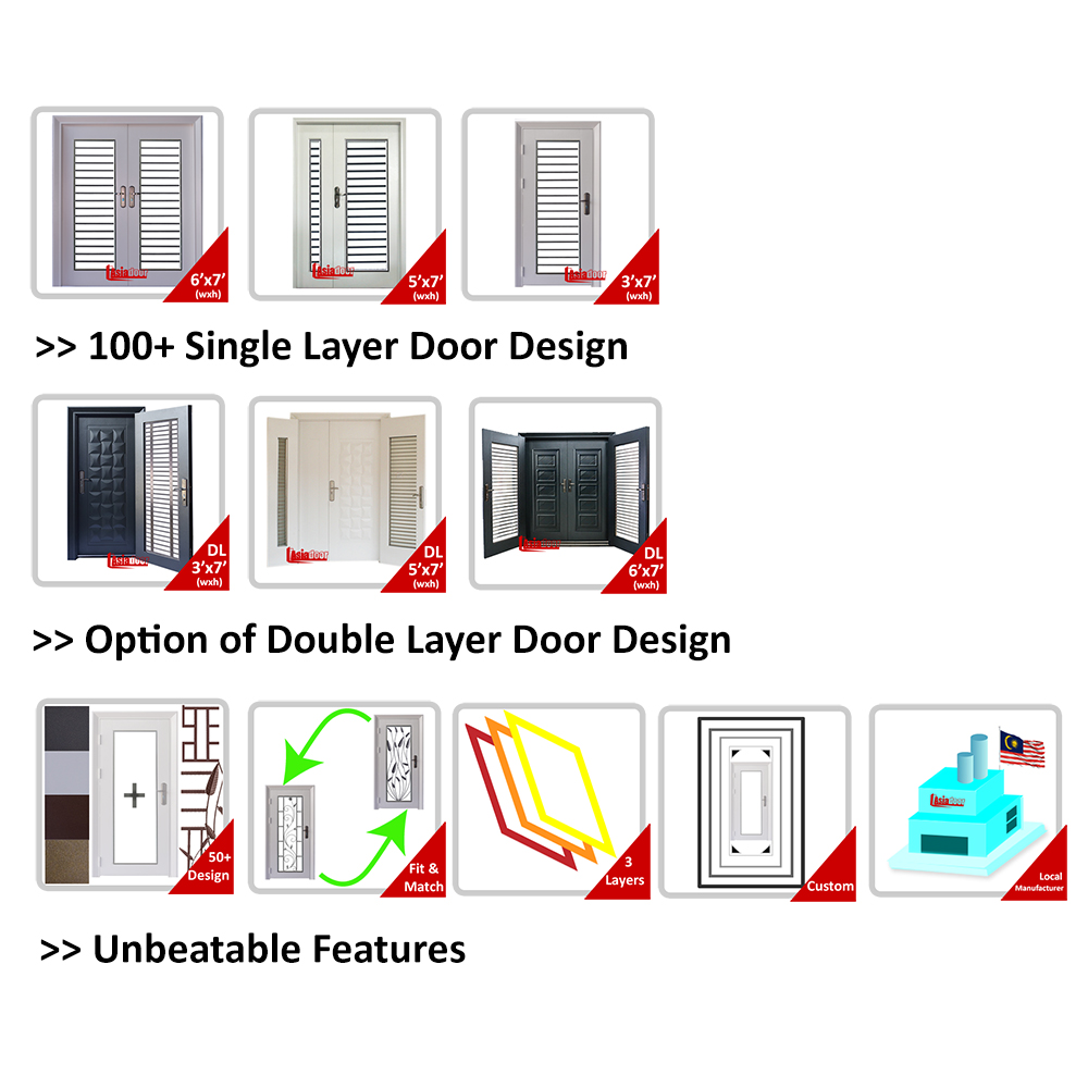 Asia Safety Door comes with variety colors of option and type of door size selections for customer enjoy the features of Strong Door frame, Heavy Duty Hinge, Anti Burglary Pin, Upper, Center and Lower Lock to enhance the door safety. With the 2 contractor keys and up to 10 master keys option, you definitely no longer required to pair another set of key.